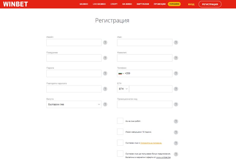 Да се регистрираш в Winbet е изключително лесно и сега ще разберете защо. Когато заредите уебсайта winbet.bg, на видно място в десния ъгъл на екрана ще видите бутон „Регистрация“. Той е оцветен в жълто спрямо черния фон на сайта, за да се отличава и потребителите да го виждат лесно. Когато натиснете върху него ще се отвори нова страница за начало на регистриране на сметка. При регистрация трябва да попълните лични данни- Имена, ЕГН, Град, Адрес и др. Трябва да въведете и данни за сметката си в сайта на уинбет – потребителско име, парола и имейл. Когато сте си направили регистрация, може в полето за вход да напишете избраното от вас потребителско име и парола и да влезете в акаунта си.